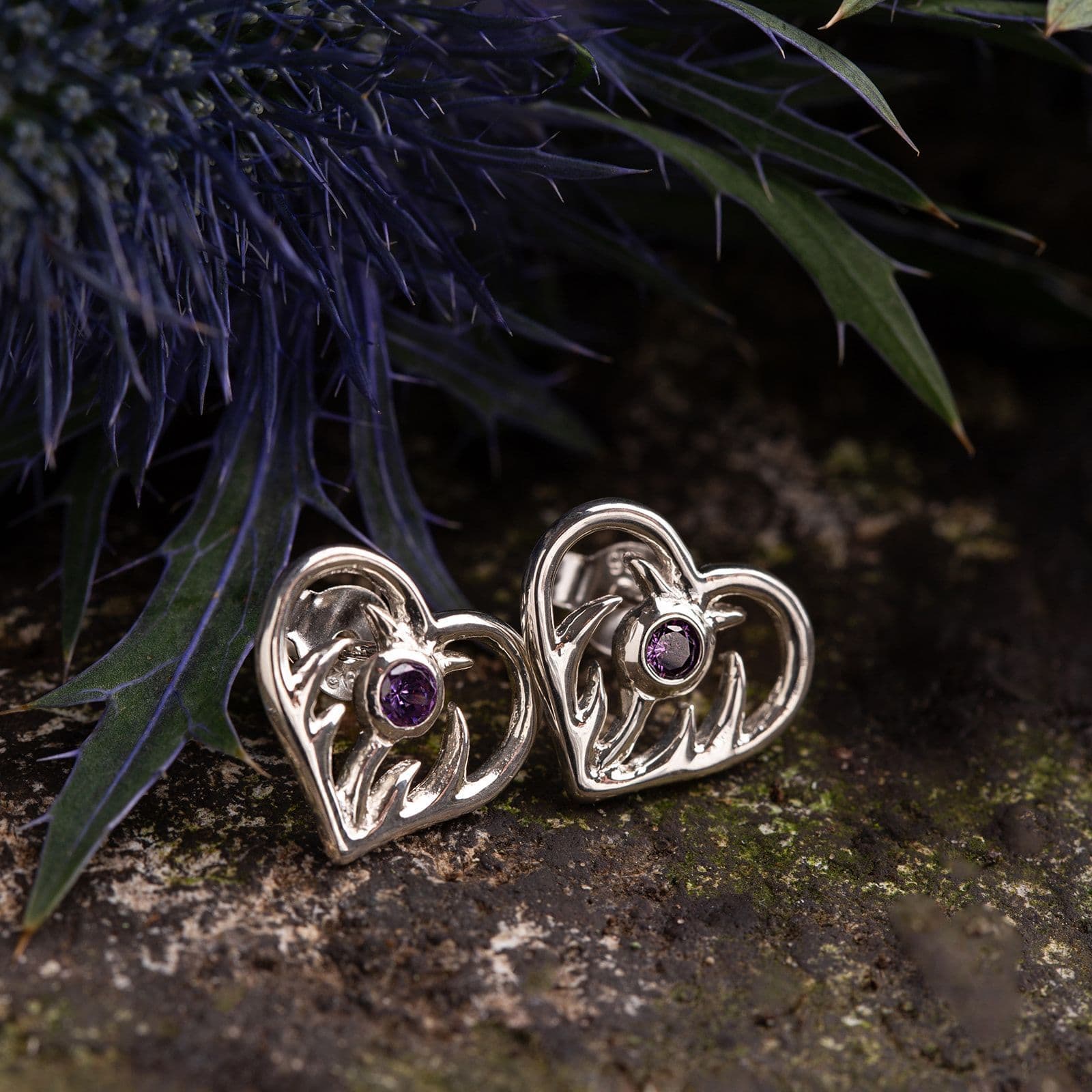 Sterling Silver Thistle Heart Stud Earrings with Amethyst 2607